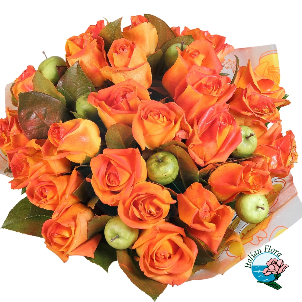 Bellissimo bouquet composto da rose arancioni, arricchito da verde decorativo di contorno e confezione.