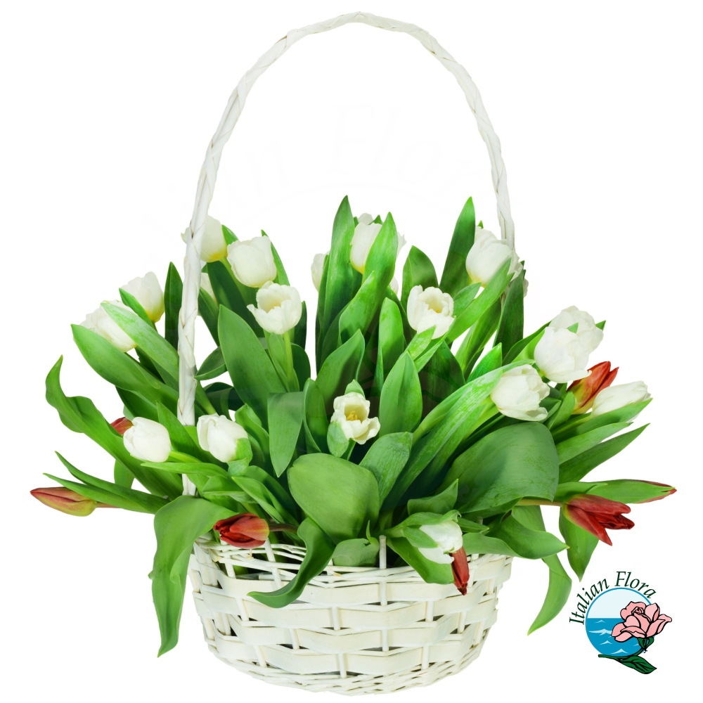 Colorato cesto di tulipani nei toni bianchi e rossi , per rallegrare una giornata speciale!